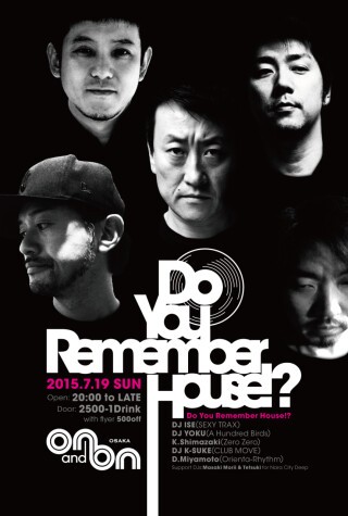 ★関西をベースに、日本におけるハウスミュージック黎明期より深くシーンに関わり、牽引してきたレジェンド達による年1回のセッションパーティー、”Do You Remember House!?”。昨年のメンバー、”生きる伝説(Living Legend)”DJ ISE、”A Hundred Birds”のDJ YOKU、”Zero Zero”のK.Shimazaki、”Orienta-Rhythm”のD.Miyamotoに加え、滋賀の”Club Move”オーナーであり、DJとしても京滋を軸に長く活動する関西ハウスシーンのキーパーソン、DJ K-SUKEを招聘。それぞれが25年を優に超えるキャリアと輝かしい実績を持つ5名のレジェンドが、リアルハウスミュージックをお届けします。