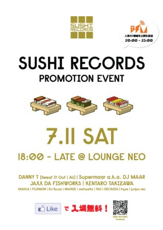 SUSHI RECORDSのSNS登録などで完全無料の入場料、更には会場限定グッズの販売、これまでのCDやグッズのクリアランスセールなど。極め付けは”SUSHI”だけに本物の"寿司"を振る舞うというお茶目なコンセプトイベント。会場からblock.FMの生放送も!