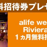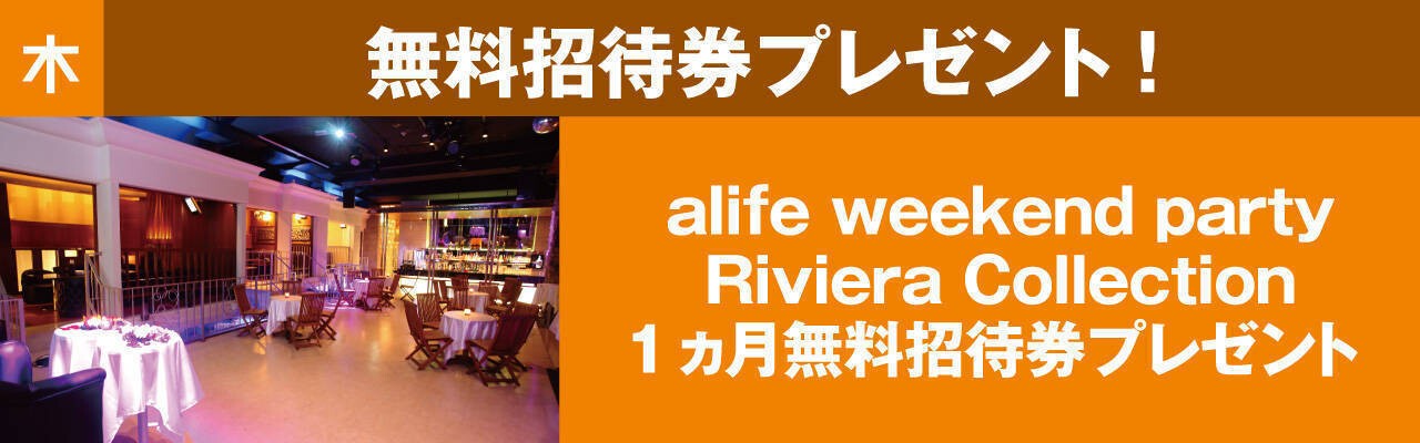翌日から使える毎週金曜日Rivieraで開催されているの “Riviera Collection” さらに毎週土曜日alifeで開催されている “alife weekend party” に1ヵ月無料招待券プレゼントと見逃せない木曜日だけの特典が登場!!