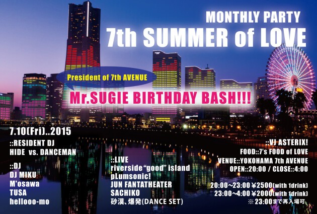 ちょうどYOKOHAMA 7th AVENUEがオープンした30年前に、遠く離れたイギリスではその後のダンスシーンに多くの影響をもたらした一つのムーヴメントが巻き起こった。それが 「The second Summer of Love」だ。それは首都ロンドンではなく、マンチェスターやリバプールなどの工業地帯が流行の中心だった。東京ではなく、横浜であるかのように...。 横浜にダンスミュージックムーヴメントを!2015年4月より「7th SUMMER of LOVE」マンスリー開催中!当日は7th AVENUEスギエ氏のバースデー!!!