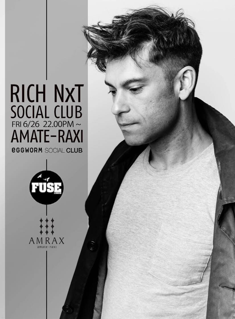 SEBASTIEN LEGER, MIRKO LOKO, MANUEL TUR, JUNIOR GEE, BASIC SOUL UNITなどアンダーグラウンドシーンのトップアーティストのみを厳選して招聘しているSOCIAL CLUBにおいても昨年11月のFUSE LONDONのアーティストSEB ZITOを招いた際のフロアのグルーヴは特別だったとの絶賛の声が多い。いま世界中のフロアで最高のグルーヴを紡ぎだし注目を浴びているレーベルがFUSE LONDONだ。ロンドン、イビサのシーンではなくてはならないパーティとなっているFUSE LONDONにおいて若くしてレジデントDJとしての地位を確立しているRich NxTのプレイを体感するまたとないチャンスが今回のSOCIAL CLUBだ。