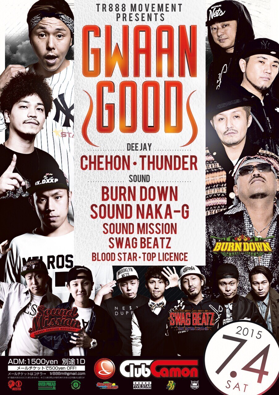 【GWAAN GOOD】7/4(土)☆TR888 MOVEMENT presents『GWAAN GOOD』★★LIVEはCHEHON、THUNDER、SOUNDはBURN DOWN、SOUND NAKA-G、SOUND MISSION、SWAG BEATZなど豪華アーティストが登場☆☆