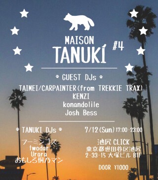 第4回目は、インターネットのみならず、都内のクラブコミュニティ、果てはBBC Radioまで、今最も注目を集めているレーベル、TREKKIE TRAXよりCarpainter。渋谷atomのレジデントDJとしてのキャリアを持ち、現在はアニソンDJとして数々のイベントをオーガナイズするKENZI。ストリーミングサイトにおけるDJ配信で日夜2000人の視聴者を獲得するkonandolile。エイブルトン公認トレーナーでありトラックメイカーとして活動するJosh Bessをゲストにフーミンゴス/おもしろ桐乃マン/twodar/uraraのタヌキメンバーで開催します。