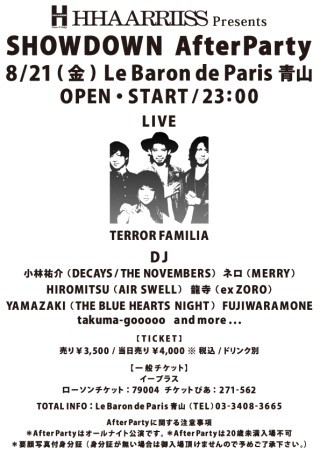 2015SSシーズンよりコレクションをスタートしたHHAARRIISS。独創的なフューチャリズムを表現した世界感を靴というパレットに落とし込み、スタッズで装飾を施したスニーカーやブーツは、ラグジュアリーでありながら程よいモードとストリートテイストで、ジャンルを問わず国内外でアーティストからも高い支持を得ている。今回はHHAARRIISS Presents SHOWDOWNのAFTER PARTYをLe Baron de Parisで開催!LIVE ACTはDIANA CHIAKIがMAIN VOCALを務めるTERROR FAMILIAが登場!