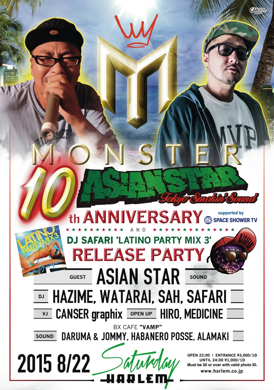 HARLEMの音の根幹をなすREGULAR PARTYを牽引する5TOP DJ、HAZIME, WATARAI, KOYA, KANGO, SAFARIが一堂に集まり土曜日を完全燃焼させる"MONSTER"。圧倒的なパワーと爆発力で他の追随を許さない。5th sat.には世界的に活躍するDJ LEADが登場。
