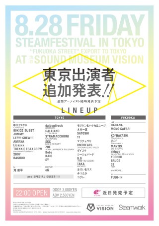 今回は会場を渋谷SOUND MUSEUM VISIONに移し、“STEAM FESTIVAL”と名を改め開催!STEAMPARTYでのグッドヴァイブスはそのままに、FUKUOKA STREET×TOKYO STREETのクロスオーヴァーを強化、パーティーのテンションを最大限まで高めていく!
