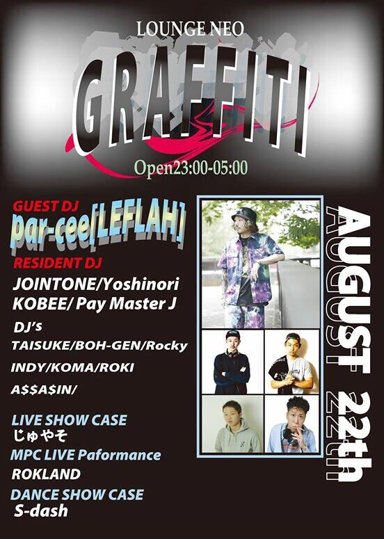 渋谷音楽カルチャーとして根強くクラブシーンに影響を与えてきたNEOにて今年の夏の後半戦。 HIPHOP、Raggae、LIVE、MPC、DANCE、をフルに組み込んだ【GRAFFITI(グラフティ)】を開催。