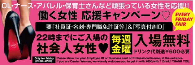 22時迄にご入場の社会人女性入場無料(ドリンク代別途¥600)