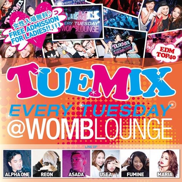 WOMB LOUNGE brings you “TUEMIX”, the weekly ALL MIX party held every Tuesday!!! Here is a party where you can enjoy the music known by all in a single night: featuring the music of EDM, now brewing up a storm not only in Asia but around the world, as well as Alesso, Hardwell, Steve Aoki, Nicky Romero, Avicii, Calvin Harris and many other artists that reached the TOP 40 chart!!! Come together now and turn up the weeknight with the most pumping music and the best of drinks!!! Free entrance for the ladies!