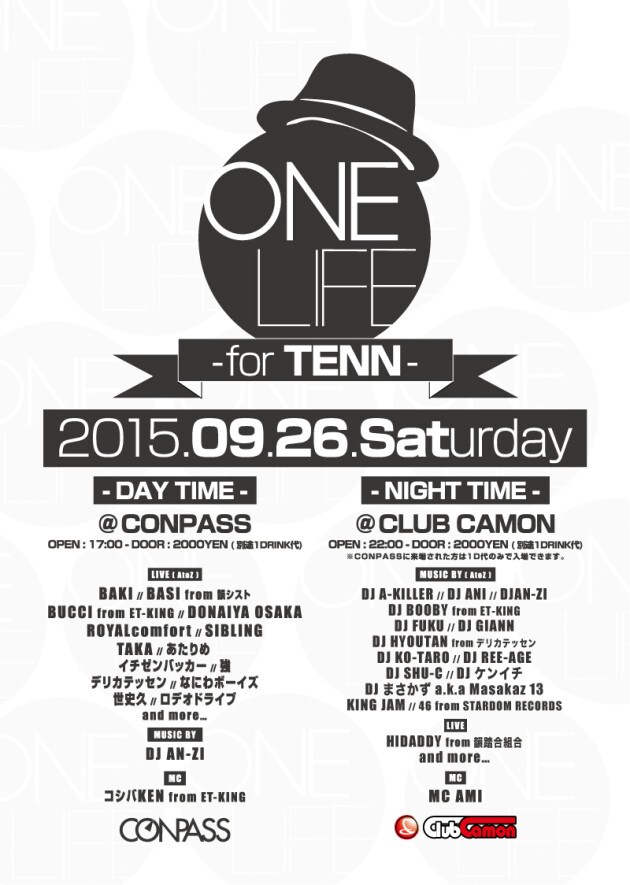 【ONE LIFE -for TENN-】9/26(土)「ET-KING TENN」一周忌追悼イベントを17:00よりCONPASSにて、22:00よりCLUB CAMONにて開催します。是非ご来場下さい。
