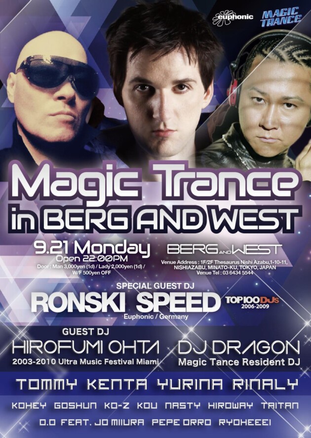 ゲストDJとして、ドイツのTrance Top レーベル「Euphonic」から、今尚世界中のトランスファンを魅了しワールドワイドに活躍し、常にBeatport Tranceチャートのトップにランクインし、過去UKのDJ MAG TOP DJ 44位にランクイン。また、Armin van BuurenのASOTへの26週に渡るフーチャリングや、多数のRemixを手掛けるなど、Trance界の貴公子「Ronski Speed」、そして、2003年に「Ultra Music Festival in Miami」に日本人として初出演し、実に2010年まで8年連続出演し、2003年「Mauro Picotto」、2004年「Sander Kleanenberg」、2006年は、「THE KILLERS」のオープニングDJをメインステージに立ち帰国した「Hirofumi Ohta」をゲストに迎え、9月21日 月曜日、「Ultra Music Festival Japan 2015」最終日の興奮冷めない東京の夜に、西麻布「Berg and West」で華やかに開催される。Ultra Japanのアフターはこれに決定 !!