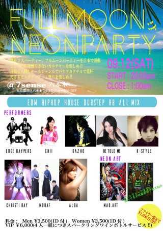 今年も昨年大好評だった屋内フェス Fullmoon NEON party が9月12日に六本木の7senceに登場!!