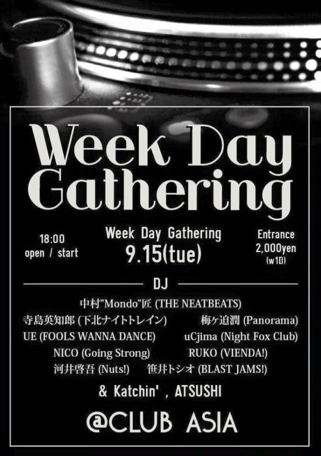 Week Day Gatheringは、己の思うままの選曲をディープに提供しようという名の元、各界隈で活躍する平均年齢30歳のフリークなDJ達が平日火曜のclubasiaに集結します。