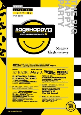 ageHa 13th Anniversary 「#ageHappy13」 日本最大のクラブイベント「ageHa」13周年パーティー開催決定!HAPPYをテーマに開催される驚きと喜びの夜!