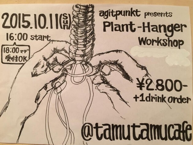 start-16:00 参加費2800円(材料費込み/1ドリンク別途オーダー制) agitpunkt presents マクラメ編みプラントハンガーのワークショップを開催します。連休中日の10/11、16時から場所はtamutamucafeです。会費は2800円で、一作品持って帰ってもらえます。人数把握のため予約制にしていますので、tamutamucafeまで予約お願いします♡