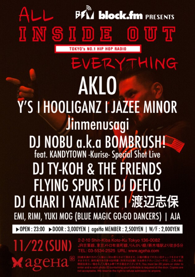 昨年ageHaにて日本の HIP HOP イベントとして大いに盛り上げ大成功をおさめたパーティであるblock.fm presents “ALL INSIDE OUT EVERYTHING ”が今年も11月22日(日・祝前日)開催することが決定!