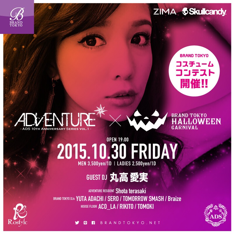 女性に圧倒的な支持を得ている人気パーティ ADS10周年企画「ADVENTURE」。今月はHALLOWEEN SPECIAL GUESTとして「丸高愛実」がBRAND TOKYO初登場。新木場ageha、大阪GIRAFFE、OWL、名古屋X-Hall等、全国の有名クラブでプレイし、その見た目とはギャップすら感じる本格的なDJプレイを認められ、2014年5月関西最大級の屋内イベント「神戸 MUSIC CIRCUS '14」の出演も果たし、ハウス、エレクトロを中心としたフロアを熱くさせるパフォーマンスで昨今、最も注目のガールズDJ。当日はコスチュームコンテストも開催!!