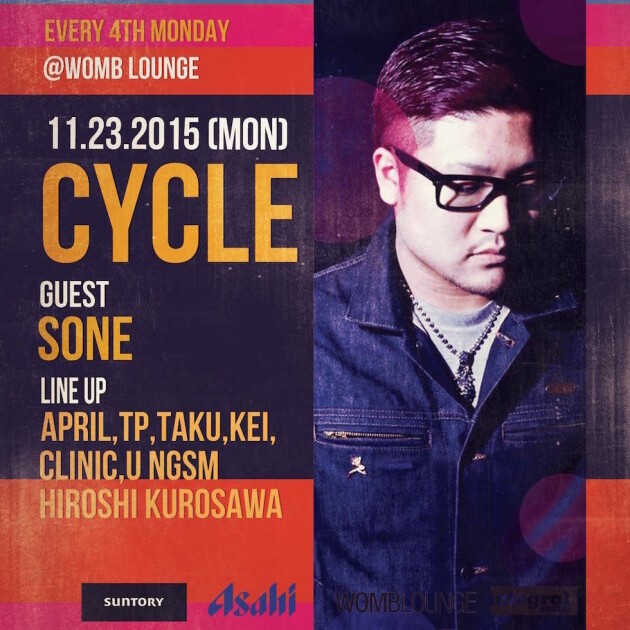 2014年の WOMB LOUNGE でのスタートから2年に渡り、週末に活躍する本格派アーティストをゲストに迎えてパーティーを続ける CYCLE が2015年ラストパーティーを開催する。この夜は、若干25歳にして年間20万人以上を動員する新木場 ageHa のレジデントを務め、過去には WOMB に於いても Bingo Players 来日時にサポートを務めるなど近年の活躍著しい SONE を迎える。