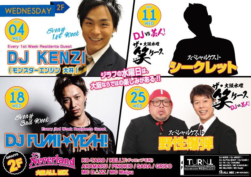 ジラフの水曜日2F(11月) DJ KENZI, シークレット, DJ FUMI☆YEAH!, 野生爆弾
