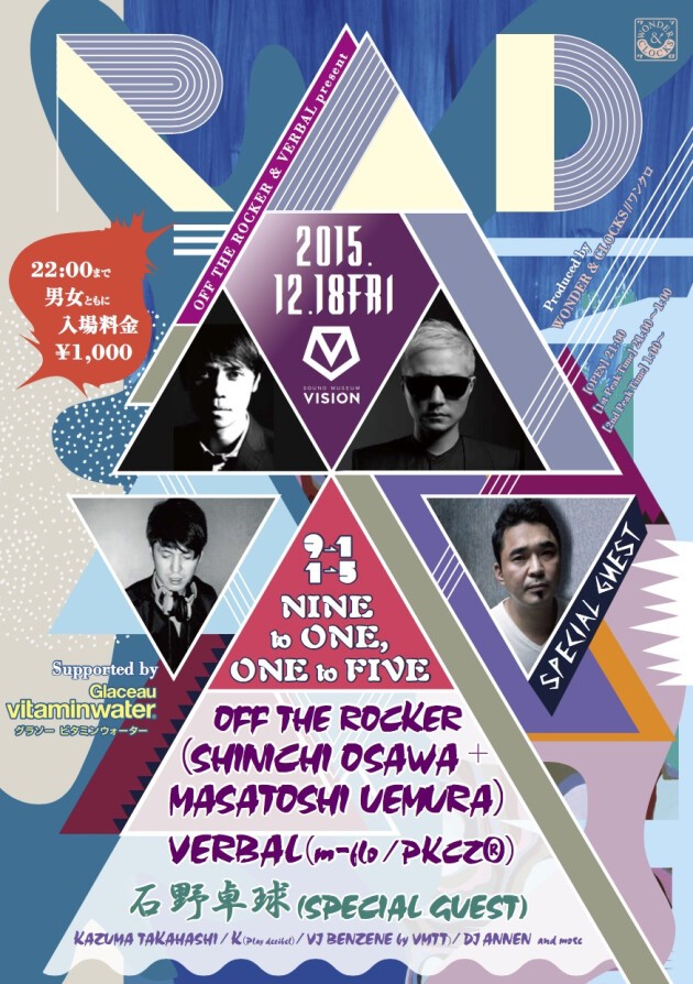 ありふれたダンスミュージックを遊撃すべく、大沢伸一と上村真俊によるDJユニット:OFF THE ROCKERと21世紀型マルチ・アーティスト:VERBALが奔放なパーティ『RAD』を開催する。退屈なミュージックライフに刺激を注入するかのごとく、“NINE to ONE(9時〜1時)” “ONE to FIVE(1時〜5時)”をテーマにした二部構成を2015年から採用。今回もその第一部には、本パーティの主役であるOFF THE ROCKERとVERBALが登場し、各自のパフォーマンスを披露する。そして、第二部はこの両者が音楽性を高く評価するアーティストや、いまフックアップすべき次世代アーティストを招聘。この日は、テクノ界の絶対的象徴:石野卓球がスペシャルゲストとして登場する。もちろん、DJブースの周囲を来場者に開放するという『RAD』おなじみのスタイルは継続。音楽性のみならず、パーティの価値をさらにレベルアップさせるため、『RAD』がまたしても挑戦的なスタイルを掲げる!!