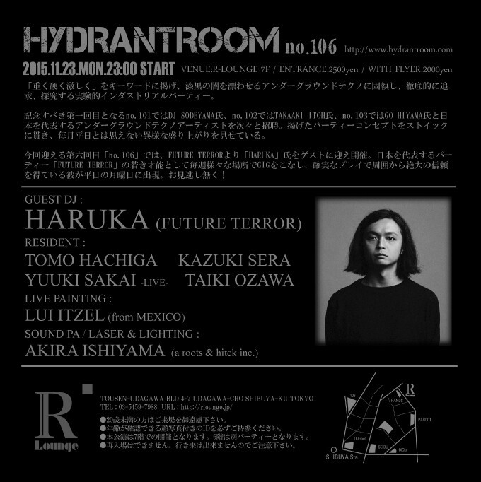 記念すべき第一回目となるno.101ではDJ SODEYAMA氏、no.102ではTAKAAKI ITOH氏、no.103ではGO HIYAMA氏と日本を代表するアンダーグラウンドテクノアーティストを次々と招聘。掲げたパーティーコンセプトをストイックに貫き、毎月平日とは思えない異様な盛り上がりを見せている。今回迎える第六回目「no.106」では、FUTURE TERRORより「HARUKA」氏をゲストに迎え開催。日本を代表するパーティー「FUTURE TERROR」の若き才能として毎週様々な場所でGIGをこなし、確実なプレイで周囲から絶大の信頼を得ている彼が平日の月曜日に出現。お見逃し無く!