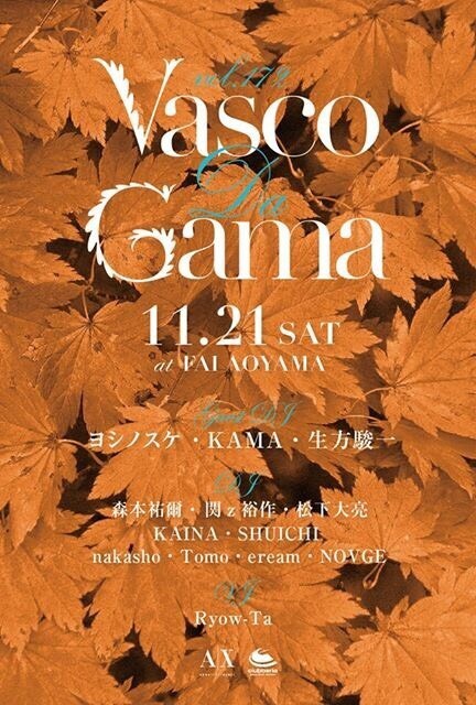 ■About VASCO DA GAMA.. 青山fai第3土曜で開催13年目のロングランイベント。 多様で長いキャリアを持つDJ陣が、自ら音楽とお酒と場の空気を楽しむために始めたイベントだけに、最新チューン中心にセレクトしつつも特定音楽ジャンルにこだわることなく、誰もが楽しめる肩に力の入らないパーティーとして人気が高い。