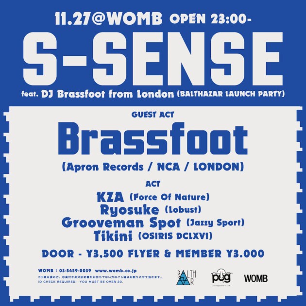 No stranger to Tokyo, Brassfoot lived and DJ'd in Tokyo under the name 'Spexsavers' from 2007-2010, so expect this S-SENSE to be a reunion of epic proportions as old friends and new come together under one groove. Sounds provided by KZA from Force of Nature, Grooveman Spot from Jazzy Sport, DJ Ryosuke from Lobust and of Future Terror fame, and finally Brassfoot's best friend and ex 'Spexsavers' DJ partner Mr.Tikini and more.