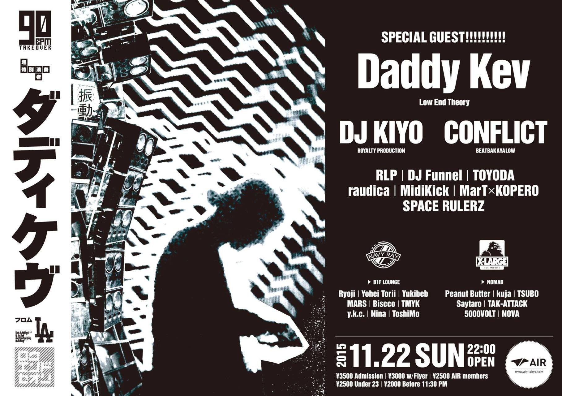 この夜AIRを舞台に、ヒップホップをルーツとしながら独自の進化と深化を続けるビートミュージックの一大祭典が実現する。ヘッドライナーとして来日するのは、「L.A.アンダーグラウンドのゴッドファーザー」と称されるDADDY KEV。現地を代表するパーティ“Low End Theory”とレーベルAlpha Pup Recordsを主宰し、独創的なプロダクションワークではFlying LotusやThundercat、Mr.Oizoといった数多くのビッグネームからの熱い称賛を獲得してきた稀有のプロデューサーである。さらに、DJ KIYOを初めとする多彩なキーパーソンたちが登場し、渾身のライヴ/DJセットを繰り広げるエキサイティングな音空間を見逃すな。