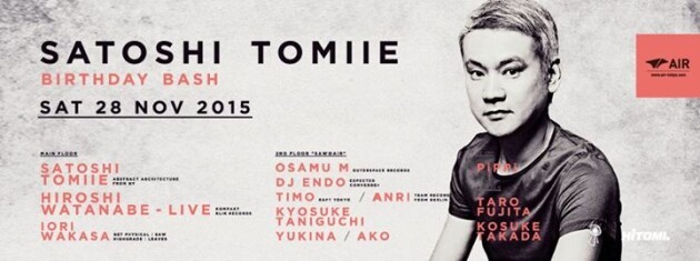 Satoshi Tomiie。AIR14年のヒストリーを語るうえで、この男の名前も欠かすことは決してできない。ハウスミュージックのゴッドファーザーFrankie Knucklesに才能を見出されてNYで活躍し、日本が世界に誇るアーティストとなった彼は、カウントダウンを初めとするビッグパーティでAIRのフロアを幾度も沸点へと導いた。さらに、'08年にスタートさせた自身の冠イベント“SAW@AIR”はTomiieリコメンドの気鋭のアーティストを知る機会として多くのオーディエンスに支持され、AIRに刻まれた金字塔の一つになっている。そんな彼のAIRラストパーティは、自らのバースデイバッシュ。皆で温かく盛大に、記念日を祝福したい。