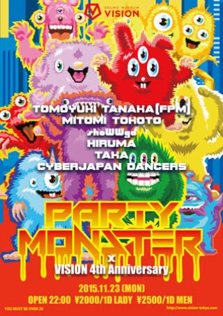 VISION MONDAYの中でも毎回平日とは思えない盛りあがりを見せ、不動の看板コンテンツになっているのが“PARTY MONSTER”だ。アニバーサリー4DAYSのファイナルとして開催される今回は、MITOMI TOKOTOがメインアクトを務め、これに華を添えるべくCYBERJAPAN DANCERSが艶やかなパフォーマンスを披露。さらに、特別な夜にふさわしくVISIONではHYPER SOCIETYのレジデントである田中知之が登場。さらり華やかな一夜となる。