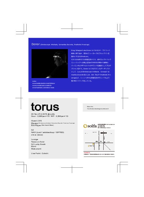 Greg Schappert aka Donor はバルセロナ・マドリード 東京と移り住み、現在はニューヨークのブルックリンを拠点とするDJ/Producer。 それらの各都市での影響を受けつつ、彼がエレクトリック ミュージックへの関心を深めた90年代中期から後期の、 バーミンガムやデトロイトのサウンドを基調としてプロダクションを行う。Donor はこれまでにソロアーティストとして、LucyのStroboscopic Artefacts、SvrecaのSemantica Recordsをはじめ、Perc TraxやProsthetic Pressingsなど、シーンへ多大な影響を及ぼすレーベルより 精力的にリリースをしている。