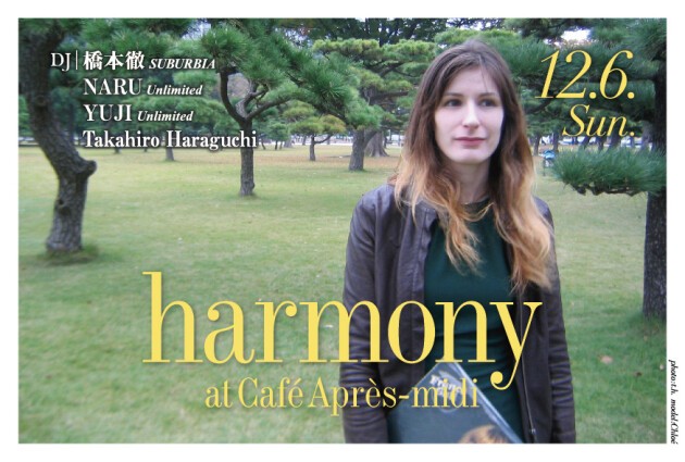 先日のharmony6周年には、多くの方がいらしてくださいました。途中、約1年間のブランクもありましたが、いろんな方がharmonyのことを大事に思ってくださっていることに気づかされ、胸がいっぱいになります。ほんとうにありがとうございました。harmony vol.34は、初心にかえり、レジデントの4人だけでの開催です。12月の日曜日、ゆるゆるとした空気が流れる居心地のよい空間を提供できたら、こんなうれしいことはありません。冬らしいハッピーなグルーヴと憩いを。よかったら、遊びにいらしてくださいませ。