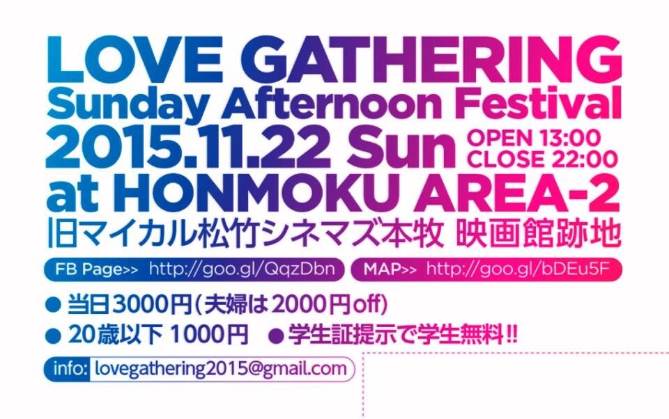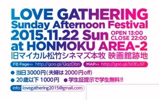 2015年11月22日、ART=SMILEをコンセプトとした屋内型アートフェスティバル[Lovegathering 2015]を同年の8月惜しくも閉館となったベイサイド横浜より会場を移し、神奈川県横浜市中区本牧に位置するHONMOKU-AREA-2(旧マイカル本牧の映画館跡)にて、4年ぶりの緊急開催が決定!!!