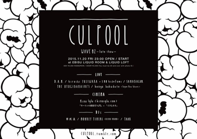 今年7月に恵比寿LIQUID LOFTを拠点にスタートし、大好評を博した「トレンドカルチャーと音楽の中で自由に遊ぶ、特別なパーティCULPOOL(カルプール)」が規模を拡大、恵比寿LIQUID ROOM1, 2F全フロアを使用して第二回目を開催します。全体で「late show(レイトショー)」というテーマを掲げ、「映画上映」と「音楽」、その他のカルチャーコンテンツを同時に楽しめる空間を提供します。-この度はそのCULPOOL-wave 02-の第二弾目のをご案内になります-