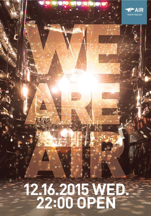 AIRラストマンス、12月。の、16日。WE ARE AIRのタイトルの元にラインナップされたメンバーは、そんなAIRの歴史の中で、それぞれの時代を駆け抜けてきたメンバーです。もちろん、他にもピックアップされるべき素晴らしいアーティストさんは多数いらっしゃいますが、この日は水曜日ということで、かつて平日開催でトピックとなっていたレギュラーパーティーのDJ / オーガナイザーさん、そしてAIR Crewの皆さんにお集まりいただきました。
