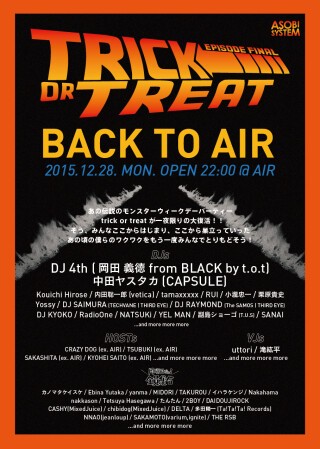 AIRの黎明期、月曜日に約1000人を集客し続けたモンスターウィークデーパーティーが在った。その名も「trick or treat」。今もなお加速し続けるアソビシステムの礎を築いたと言っても過言ではない重要なアイコンだ。多くの人々に衝撃を与えたAIRクローズのニュースを受け、伝説のパーティが一夜限りの復活を果たす。DJ 4th (岡田 義徳 from BLACK by t.o.t)、中田ヤスタカ(CAPSULE)らtrick or treatのレジデントクルーはもちろん、派生した「RED by t.o.t」と「BLACK by t.o.t」のメンバー、そして同時期に界隈の「月曜日パーティ」を盛り上げていた「varium」「MixedJuice」などの盟友達も集結。色褪せない多くの想い出を抱え、「最期の月曜日」が今宵幕を開ける。