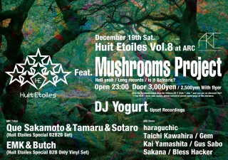 2015年締め括りとしてイタリアか らMushrooms Projectが待望の来日。 またDJ YogurtがHuit Etoiles初出演。 今回はHuit EtoilesのSpecial企画として、 普段とは一味違ったレアな内容をお届けする。