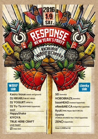去年のRESPONSE新年会は代官山AIRで開催されていたParty「groundrhythm」とのコラボレーション開催でしたが、今年はAIRの閉店にともない会場を吉祥寺弁天通りにあるMusic Spot「WARP」「Cheeky」へ移動し、二店舗を解放して開催します♬