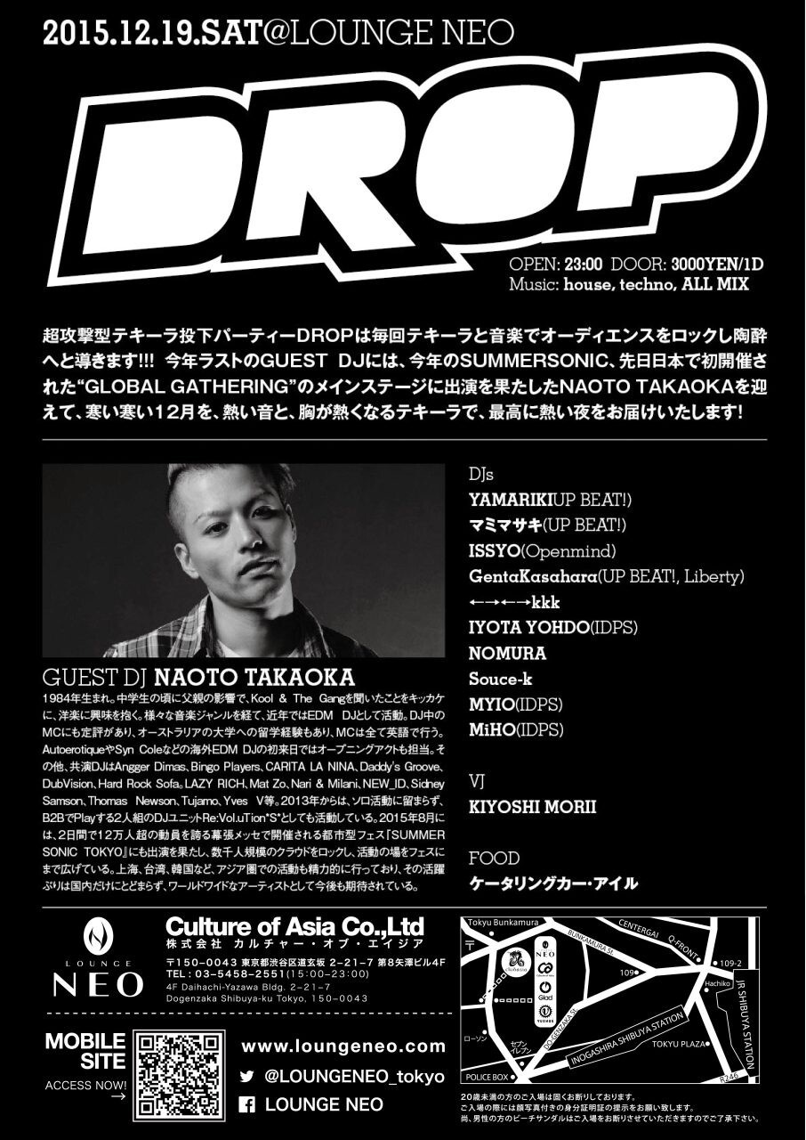 今年ラストのGuest DJには、今年のSUMMER SONICや、先日日本で初開催された【GLOBALGAHERING】のメインステージに出演を果たした「Naoto Takaoka」を迎えて、寒い寒い12月を、熱い音と、胸が熱くなるテキーラで、最高に熱い夜をお届けいたします!!