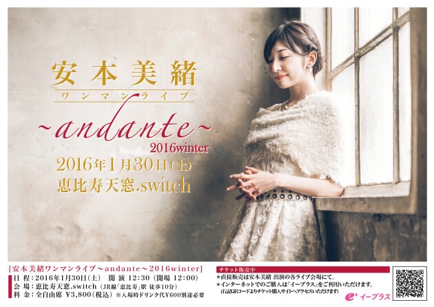 2015年5月にマウントレーニアホール渋谷での初コンサートを成功させた安本美緒の次回ワンマンライブ決定! どんな時も前を向き続ける姿は初めて聴く人にも感動と勇気を与えます。 走り続けるあなたの心に届き、そっと寄り添える歌を。 そんな安本美緒の新たなシリーズを見届けよう!