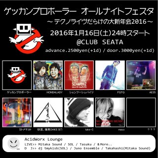 ゲッカンプロボーラー主催オールナイト新年会。9月のvsハードフロアを盛り上げたゲツプロ、ホンダレディ、シェンフーシュバイツをはじめ、テクノライヴアーティストが大集結!さらにラウンジフロアではアシッドハウス専門レーベル「AcidWorx」のクルーがLIVE&DJで参戦。
