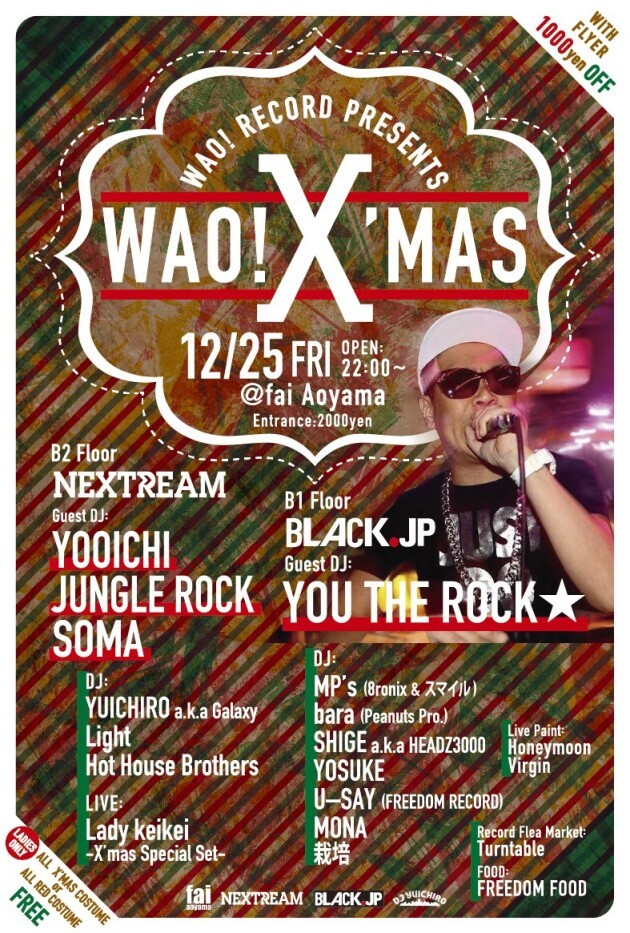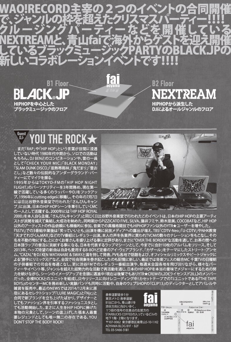 クルージング・パーティーなどを開催しているNEXTREAMと、青山Faiで、海外からゲストを迎え開催しているブラック・ミュージック・パーティー、BLACK.JPのコラボレーションとなり、NEXTREAMがキュレーションするB2フロアはヒップホップから派生したDJたちによるオールジャンルのフロア、そしてBLACK.JPが担当するB1はヒップホップを軸としたブラック・ミュージック全般のフロアとなり、2フロア往き来自由の、常に異なるサウンドが楽しめる、ジャンルレスなクリスマスパーティーイベントです!
