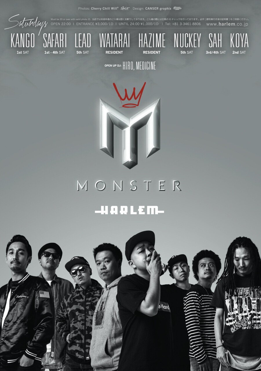 HARLEMの音の根幹をなすREGULAR PARTYを牽引する5TOP DJ、HAZIME, WATARAI, KOYA, KANGO, SAFARIが一堂に集まり土曜日を完全燃焼させる"MONSTER"。圧倒的なパワーと爆発力で他の追随を許さない。5th sat.には世界的に活躍するDJ LEADが登場。