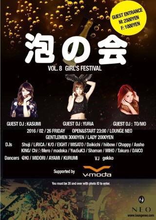 今回は2016年第1弾として、場所をLOUNGE NEOに移し、YURiAを始めとした全国区で活躍する豪華フィメールDJ陣と共に、「Girl's Festival」としてまさに祭りの時間を提供する。