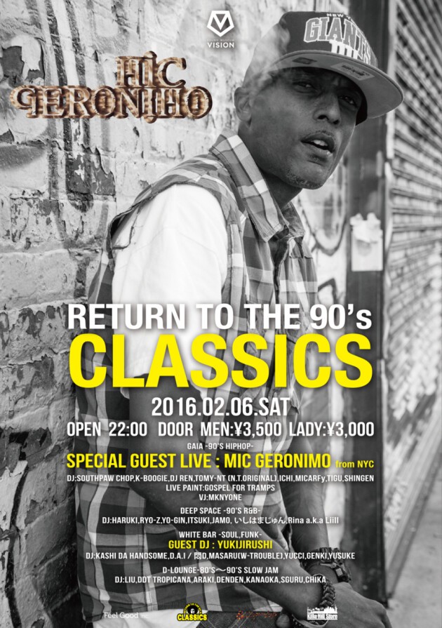 毎回HIP HOPの黄金時代90年にスポットを当てたパーティ”CLASSICS”。今回は95年に「シッツ・リアル」でのし上がったクイーンズ出身のラッパー“MIC GERONIMO(マイク・ジェロニモ)”が登場する。