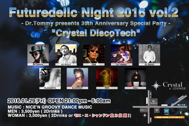 そしてなんと『Futuredelic Night』を主宰するレジデントDJ Dr.Tommyの、DISCO、CLUB、BAR、放送媒体、イベント、ショー、そして様々なPARTYなどでのDJとしての活動歴も35周年を迎える今年、2016年第二弾の 『Futuredelic Night』は、このラインナップで盛り上がり間違いなし!!