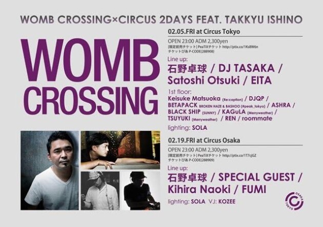 WOMBとCIRCUSのコラボレーションイベント「WOMB CROSSING × CIRCUS 2 DAYS FEAT. TAKKYU ISHINO」が2月5日(金)CIRCUS TOKYO、2月19日(金)CIRCUS OSAKAの2都市にて開催