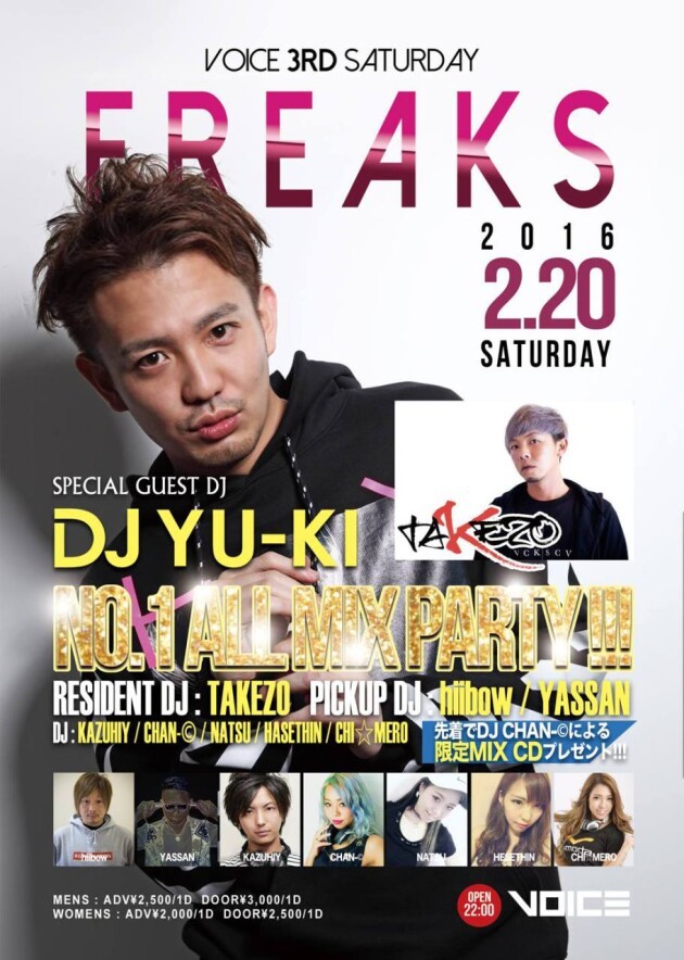2月のフリークスは、ゲストにお馴染み、日本全国で大活躍のAQUA PRODUCTIONから【YU-KI】!
