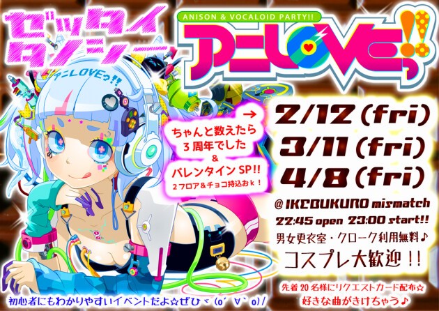 毎月第2金曜夜、池袋密マッチで開催中☆流行のアニソンボカロで朝まで遊べます!!