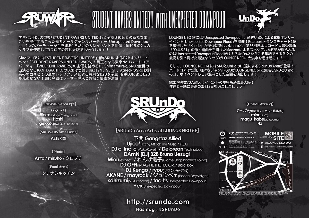 ハードコアは勿論、様々なジャンルのDJがLOUNGE NEO 6Fに集結しSRUとUnDoのコラボイベントらしい混沌とした空間を演出します!